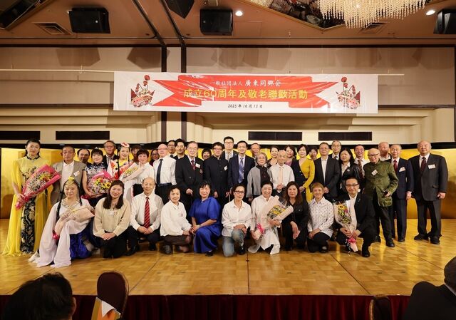 一般社団法人廣東同郷会(朱銘江会長)は、10月13日(月・祝)正午、横浜中華街の「ローズホテル横浜」で社団法人設立60周年と敬老を寿ぐ祝賀会を盛大に開催した。当日は尹星副会長と陰玉慧氏がAI技術を織り交ぜ司会進行を務めた。